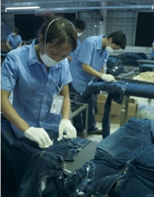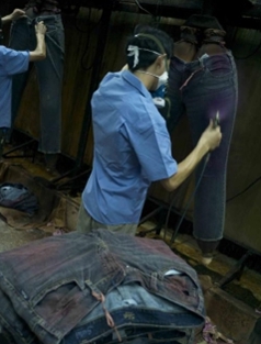 三:臭氧氧化與傳統方法的優缺點比較 1. 用次氯酸鈉(婆梅度為18度)經濟;不好控制,有傷布的纖維。健康危害:經常用手接觸本品的工人,手掌大量出汗,指甲變薄,毛發脫落。本品有致敏作用。本品放出的氯氣有可能引起中毒。具腐蝕性,可致人體灼傷,具致敏性。 2. 用亞氯酸鈉和硫酸在加次氯酸鈉。價格比上一種高點。但比上一種好點。不傷布的纖維。亞氯酸鈉有強氧化性。在175℃時即分解而發熱,與可燃物質接觸,即起猛烈爆炸,須注意安全。硫酸對環境有危害,對水體和土壤可造成酸性污染。具強腐蝕性、強刺激性,可致人體灼傷。 3. 高錳酸鉀、過醋酸和還原漂白方式 關于牛仔布漂白,除了用次氯酸鈉和亞氯酸鈉外,還可以用高錳酸鉀、過醋酸和還原漂白方式,具體需要根據牛仔布所用染料類型來選擇,傳統牛仔為還原淀籃染料,也有用硫化染料或直接染料代替,也有采用活性染料代替的,故此,需要根據具體情況考慮。 4. 臭氧氧化的優點 a) 無污染,臭氧為純凈物。在常溫下,易分解,生成氧氣和氧原子 b) 臭氧的氧化能力極強。 c) 運行成本低 四:手工處理 1.手擦 a) 在洗水前,通過使用砂輪滾動摩擦而使布面染料褪色,手擦的地方通常是脾位和臀位,人為的機械褪色,讓牛褲在洗水后顯得自然地懷舊和泛白 b) 噴沙和手擦效果接近,但對布紋的效果有差別。噴沙后布紋模糊,沉底,而手擦后布紋清晰凸顯